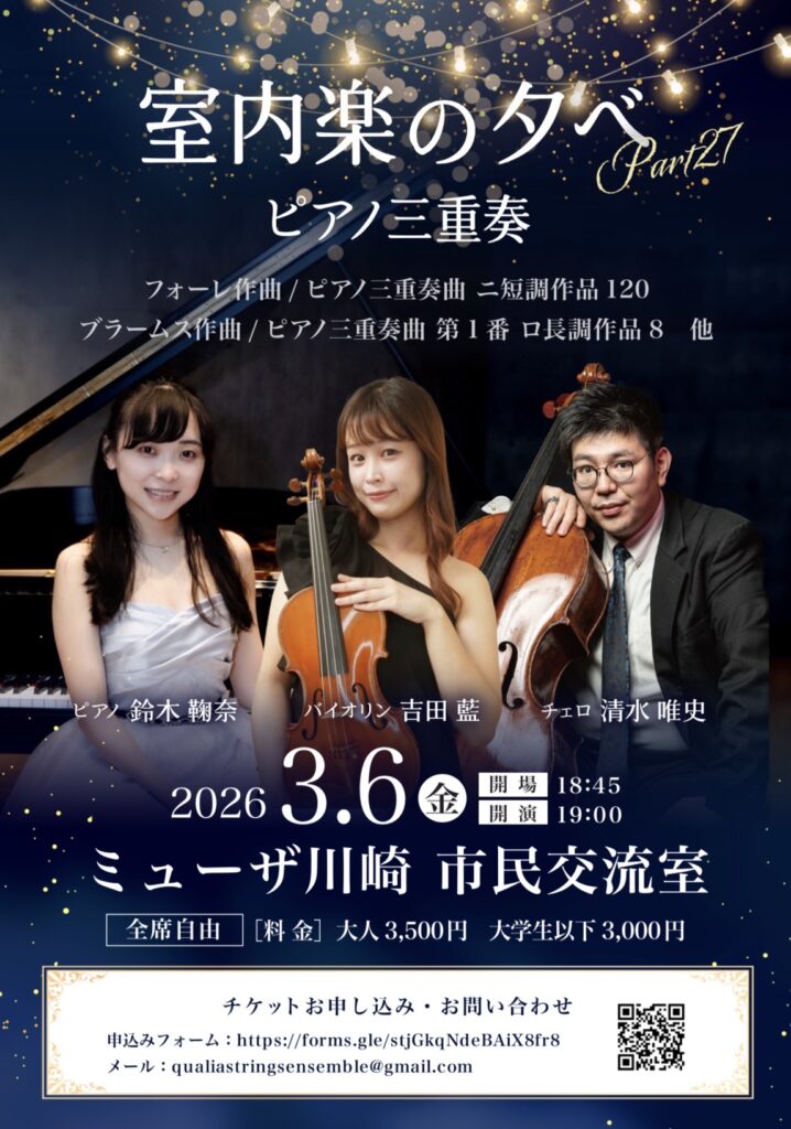 開催日 : 2026年3月6日(金) 開演:19:00 開催地 : 〒212-8557 神奈川県川崎市幸区大宮町1310 ミューザ川崎市民交流室 お問い合わせ : qualiastringsensemble@gmail.com チケット ...